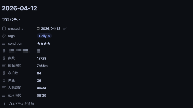 元々DailyNoteには体調の主観評価、歩数、睡眠時間あたりを記録していたが、ここに心拍数、体温、入眠時間、起床時間を追加した。