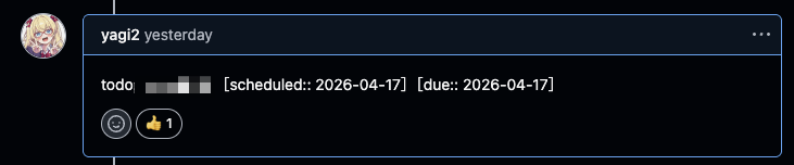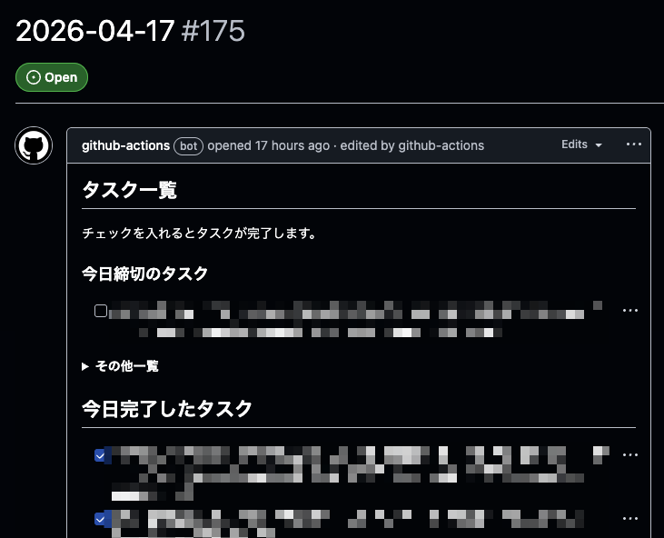 Obsidian上でチェックを入れた場合はTasksプラグインが同じことをやってくれるのだが、問題はスマホから操作するときで、ObsidianのモバイルアプリよりGitHub Issueにコメントを打つ方が圧倒的に手軽だった。スマホからIssueにコメントするだけでタスクの追加・完了ができるのは想像以上に便利で、これのおかげでタスクの取りこぼしが体感で減った。