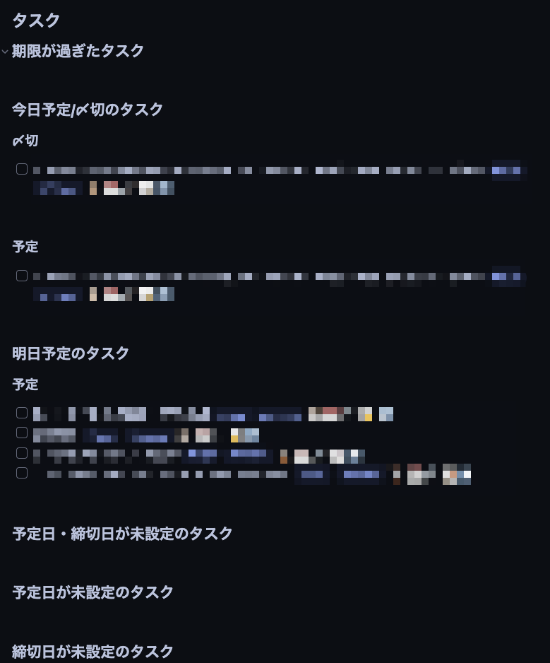 代わりにDailyNoteとDaily Issue上に「日付が未設定のタスク」を一覧表示するセクションを設けた。未設定のタスクが目に入るので、朝の段階で「これ今日やるか」「これは来週でいいか」を判断して日付を入れるフローになった。