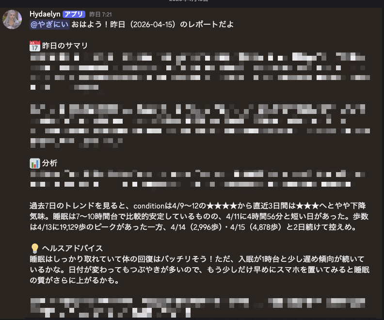 月次レポートにもヘルスデータの分析を組み込んでいて、「睡眠時間が短い日は心拍数が高い傾向にある」みたいな相関が見えるようになった。自分の体をデータで把握できるのは思った以上に面白い。