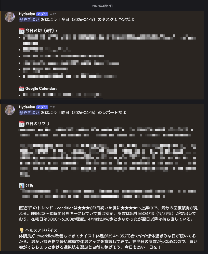 これは最初AI使って生成しようかと思ったが、毎朝のものなのでコストがもったいない。普通にスクリプトを書いてGitHub Actions上で完結させている。朝起きてDiscordを開くだけで今日やるべきことが把握できるので、出社前のバタバタした時間でも取りこぼしが減った。
