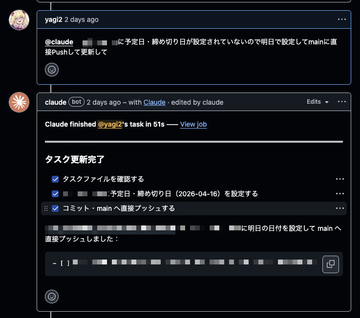 GitHubにClaude Code Botも入れているので、IssueからClaudeに「このタスク明日にリスケしておいて」という指示でアップデートも可能になった。